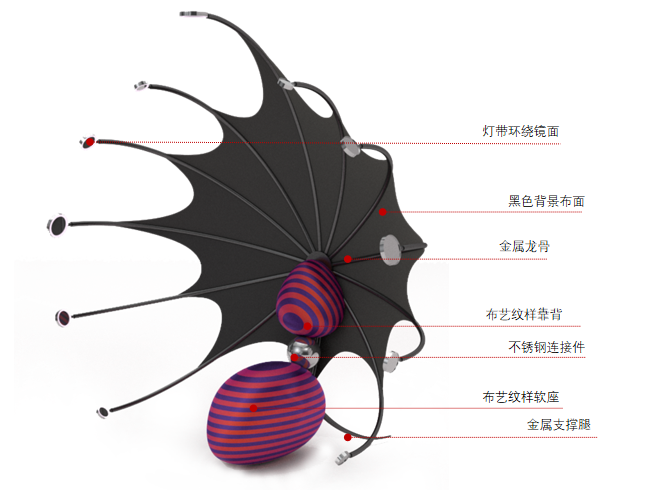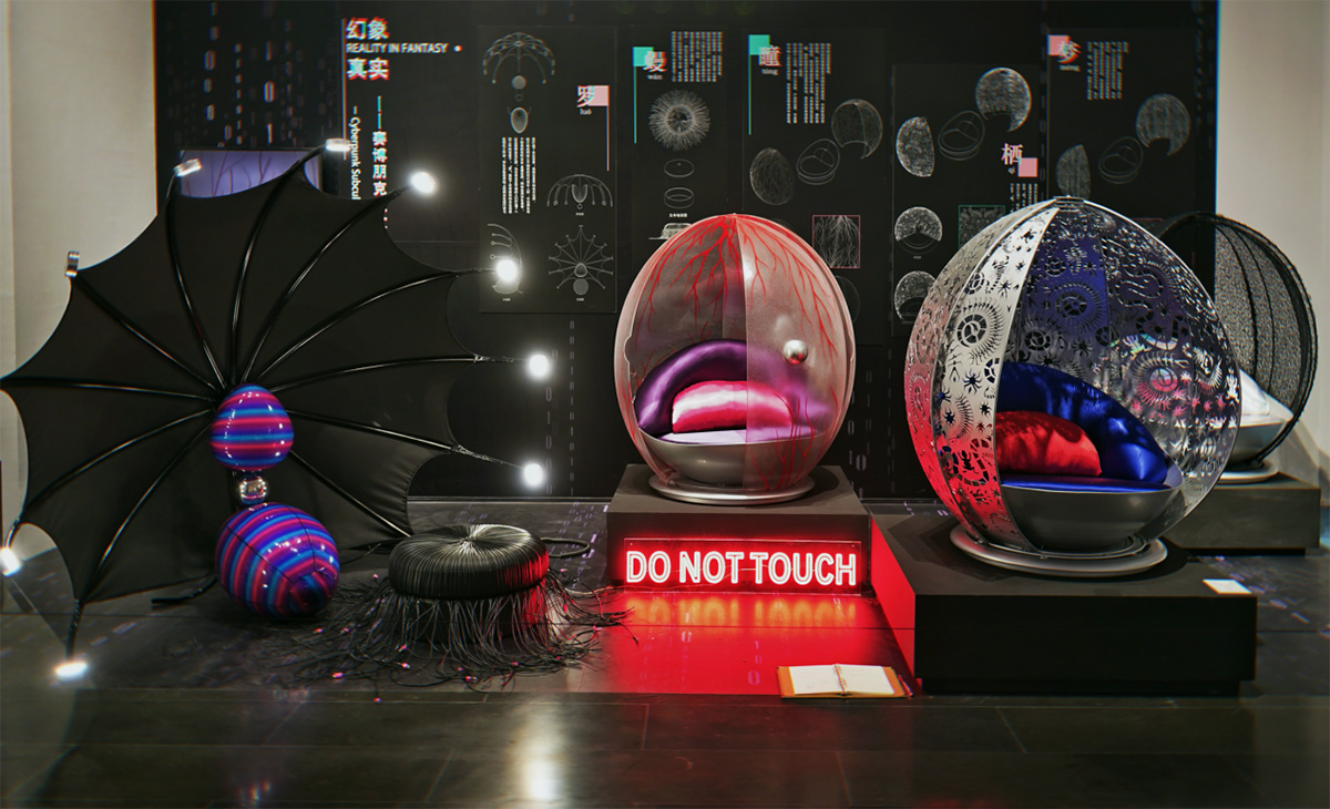 作為賽博朋克01號的第三版衍生椅,“夢”運(yùn)用了黑色蕾絲面料作為外殼,加以金屬龍骨內(nèi)部支撐固定,其余面料則采用鐳射光澤面料,在黑色外殼包裹下通過觀看角度的變化也會有視覺感受的色彩變化。給人以被黑霧籠罩的魔幻感受。同樣此版本作為單人座椅,軟性地隔離了內(nèi)外部空間。