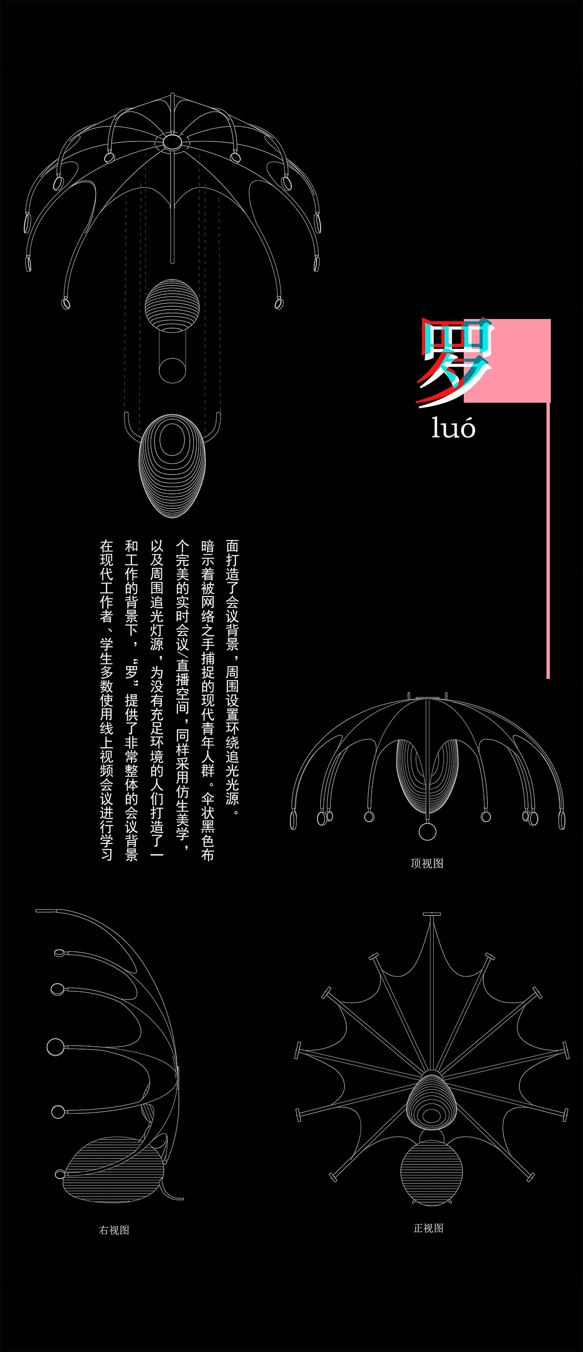 賽博朋克02號靈感來于現(xiàn)代的工作者和學(xué)生大部分使用線上視頻會議進(jìn)行學(xué)習(xí)工作的情況。在線上會議中,大多數(shù)人需要整潔的空間背景,但現(xiàn)實(shí)生活中很難找到可供多數(shù)人使用的單人背景空間,02號采用黑色背景布面,固定龍骨以及龍骨末端所固定的燈帶鏡面構(gòu)成鏡面多角度為使用者追加光源,為沒有充足環(huán)境的人們打造了一個(gè)可供視頻的完美單人場景,并且采用仿生美學(xué)暗示著被現(xiàn)代的網(wǎng)絡(luò)之手所捕捉的青年人群。