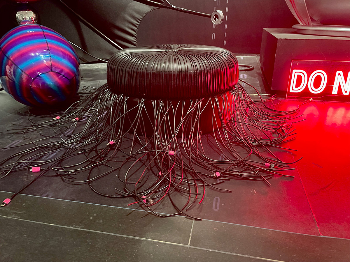賽博朋克04號是以現(xiàn)代人無處不在的充電需求作為出發(fā)點(diǎn)。其美杜莎一樣的線纜是形態(tài)構(gòu)成的主要元素。04號是由金屬軟管與龍骨的硬紙鋼管組成的單人高腳椅,影射現(xiàn)在社會人們被電子產(chǎn)品和信息所迷惑,高腳椅象征著權(quán)力的座位,讓人感受到力量的同時(shí),但卻忘記了自己也受電子產(chǎn)品的束縛和荼毒,逐漸喪失脫離其掌控的能力。